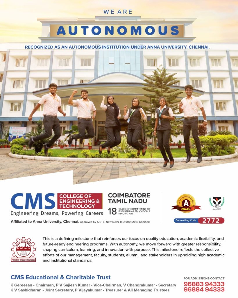 A centre of excellence, capable of empowering seekers of knowledge through holistic education. Institution for Technical Education established in the academic year 2009-10, by few eminent persons, who are members of Coimbatore Malayali Samajam, under the banner of CMS Educational and Charitable Trust. The Trust has started this institution with a commitment to train the next generation of Engineers and Technocrats. The motto of the college “Challenge Meets Success” emphasizes its great mission of Education